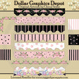 This collection includes nine assorted borders and five background tiles - six scalloped borders with black, pink, and white polka dots, flowers, and stripes, one scalloped border with bath and body products, one pink floral border, one pink floral corner border, and five polka dot and striped backgrounds in pink, black, and white. This set contains 14 graphics.