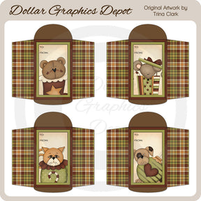 This collection includes four holiday gift card envelopes, depicting cute little Christmas animals - a teddy bear peeking out of a Christmas stocking, a mouse peeking out of a wrapped Christmas box with a candy cane, a kitty cat peeking out of a Christmas mitten, and a puppy dog peeking around a Christmas ornament. PLEASE NOTE: This set coordinates with the "Christmas Furbies - Clip Art," "Christmas Furbies - Cards," "Christmas Furbies - Tags," "Christmas Furbies - Cupcake Wrappers," "Christmas Furbies - Signature Tags," "Christmas Furbies - Stationary," "Christmas Furbies - Labels," and "Christmas Furbies - Blocks" collections. This set contains 4 printable gift card envelopes.