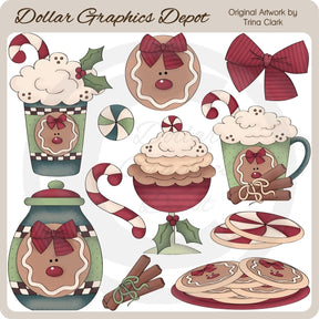 This collection includes gingerbread Christmas mugs filled with hot chocolate, whipped cream, and candy cane stirrers, a gingerbread cookie, a pretty red bow, a peppermint candy, a candy cane, cinnamon sticks, an ice cream sundae, peppermint cookies, a plate filled with gingerbread cookies, and a gingerbread cookie jar. PLEASE NOTE: This set coordinates with the "Christmas Sweets - Scrap Papers" collection. This set contains 11 graphics.