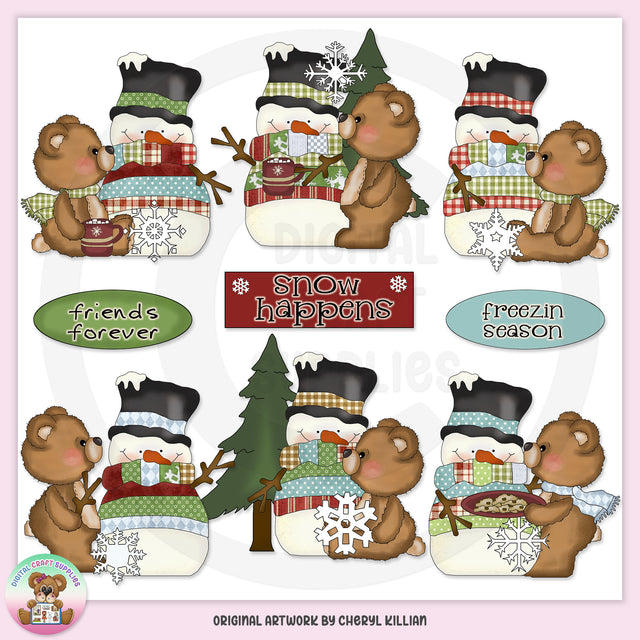 This collection includes adorable winter snowmen with with winter coats, scarves, and top hats, cute little fuzzy bears with winter scarves, pine trees, snowflakes, mugs of hot cocoa with marshmallows, a platter of chocolate chip cookies, one rectangular word art graphic - "Snow Happens," and two oval word art graphics - "Forever Friends" and "Freezin Season." This set contains 9 graphics.