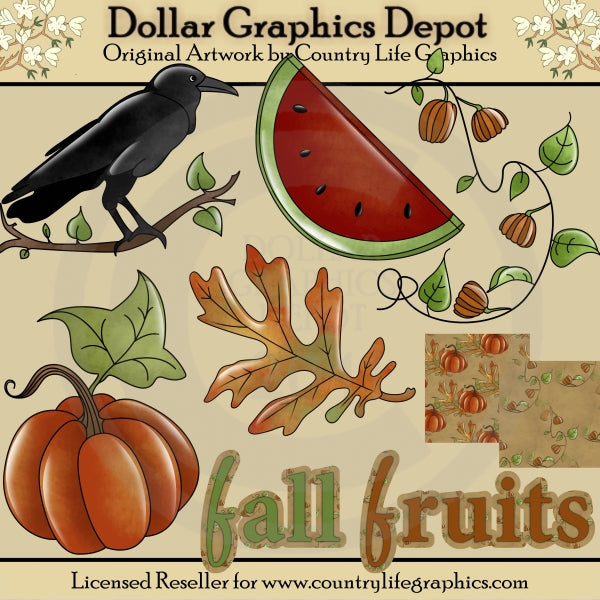 This collection includes a black crow sitting on a tree branch, a watermelon slice, a mini pumpkin vine, a beautiful autumn leaf, a pretty fall pumpkin, one "Fall Fruits" word art graphic, and two matching grungy paper backgrounds - one with autumn leaves and pumpkins, and one with mini pumpkin vines. This set contains 8 graphics.