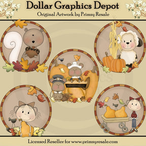 This collection includes pretty red and gold framed, fall scenes with a squirrel, sheep, pilgrim mice, fall girls, colorful autumn leaves, acorns, pumpkins, black crows, cornstalks, pumpkin pie, Indian corn, and a wagon filled with pumpkins. This set contains 5 graphics.