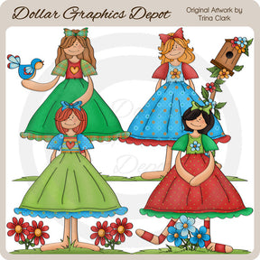 This collection includes four adorable garden girls, with pretty dresses and matching hair bows, colorful flowers, patches of grass, a little blue bird, and a floral bird house. PLEASE NOTE: This set coordinates with the "Garden Cuties - Scrap Papers," "Garden Cuties - Background Tiles," and "Garden Cuties - Gift Tags" collections. This set contains 4 graphics.