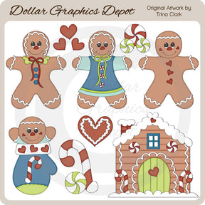 This collection includes cute little gingerbread men and gingerbread ladies, a Christmas mitten, red hearts, peppermint candies, and a decorated gingerbread house. PLEASE NOTE: This set coordinates with the "Jolly Gingerbread 2 - Clip Art" collection. This set contains 9 graphics.