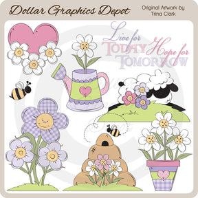 This collection includes a floral heart, a watering can with a pretty flower, a bumble bee, a patch of grass with a sheep and pretty flowers, a patch of grass with pretty flowers, a patch of grass with a beehive, a bumble bee, and pretty flowers, a flowerpot with pretty flowers, and one "Live For Today Hope For Tomorrow" word art graphic. PLEASE NOTE: This set coordinates with the "Live For Today - Scrap Papers" collection. This set contains 8 graphics.