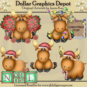 This collection includes five adorable Christmas moose - one with lots of pretty poinsettia flowers, one with a Christmas storage box, garland, and tangled up Christmas lights, one with a Santa hat, poinsettia candle, and poinsettia Christmas blocks, one with a Santa hat, and one with a Santa hat, candy cane, and Christmas ornaments hanging from his antlers. This set contains 5 graphics.