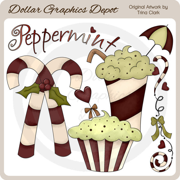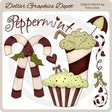 This collection includes candy canes with holly berry leaves, a frosted peppermint cupcake with a heart decoration, a peppermint milkshake with a little umbrella, a pretty peppermint border, and one "Peppermint" word art graphic. This set contains 5 graphics.