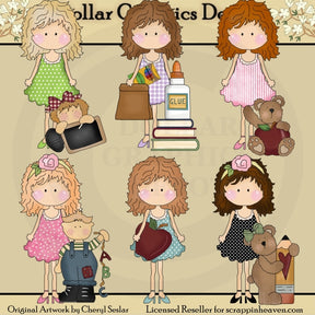 This collection includes six pretty school teachers, a little girl with a chalkboard, a brown sack lunch, a box of crayons, schoolbooks, a bottle of glue, stuffed teddy bears, red apples, a little boy with alphabet letters, and a pencil. This set contains 6 graphics.
