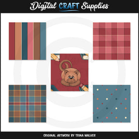 This collection includes five school kitty cat background tiles. Patterns include: stripes, gingham, plaid, polka dot, and kitty cats with books and pencils. PLEASE NOTE: This set coordinates with "School Kitties 1 - Clip Art," "School Kitties 1 - Scrap Papers," "School Kitties 1 - Borders and Tags," "School Kitties 1 - Digital Stamps," "School Kitty 1 - Cutting Files / Paper Piecing Patterns," and "School Kitty 2 - Cutting Files / Paper Piecing Patterns" collections. This set contains 5 background tile graphics.