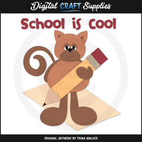 This collection includes cutting files that can be used to create this adorable school kitty craft project (shown “finished” in preview) – a kitty cat with a pencil, a piece of paper, and "School Is Cool" word art.