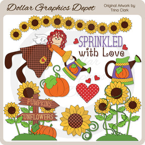 This collection includes an autumn angel with a water pitcher, a patch of grass with pumpkins, sunflowers, and a wooden sign that reads: "Pumpkins - Sunflowers," a fall pumpkin, a pretty sunflower, a patch of grass with sunflowers, a painted water pitcher, red hearts, a sunflower border, and one "Sprinkled with Love" word art graphic. PLEASE NOTE: This set coordinates with the "Sprinkled with Love - Scrap Papers" collection. This set contains 9 graphics.