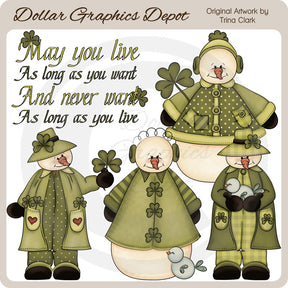 This collection includes St. Patrick's Day snowmen with winter outfits, coats, hats, ear muffs, shamrocks, little birds, and one Irish saying - "May You Live As Long As You Want And Never Want As Long As You Live." PLEASE NOTE: This set coordinates with the "St. Patty's Snowmen - Scrap Papers" collection. This set contains 5 graphics.