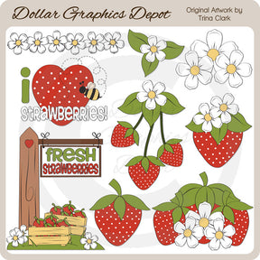 This collection includes strawberries, pretty flowers, a patch of grass with pretty flowers, crates of strawberries, and a wooden sign with with a little heart and "Fresh Strawberries" word art, one "I Love Strawberries" word art graphic with a little bumble bee, and one coordinating floral divider. PLEASE NOTE: This set coordinates with the "Strawberry Patch - Scrap Papers" collection. This set contains 9 graphics.