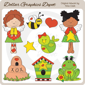 This collection includes a little angel holding a heart, a little angel holding a star, a beehive, a bumble bee, a birdhouse, a bird, a frog on a lily pad, a star, and a heart. PLEASE NOTE: This set coordinates with the "Summer Days 1 - Scrap Papers" and "Summer Days 1 - Digital Stamps" collections. This set contains 9 graphics.