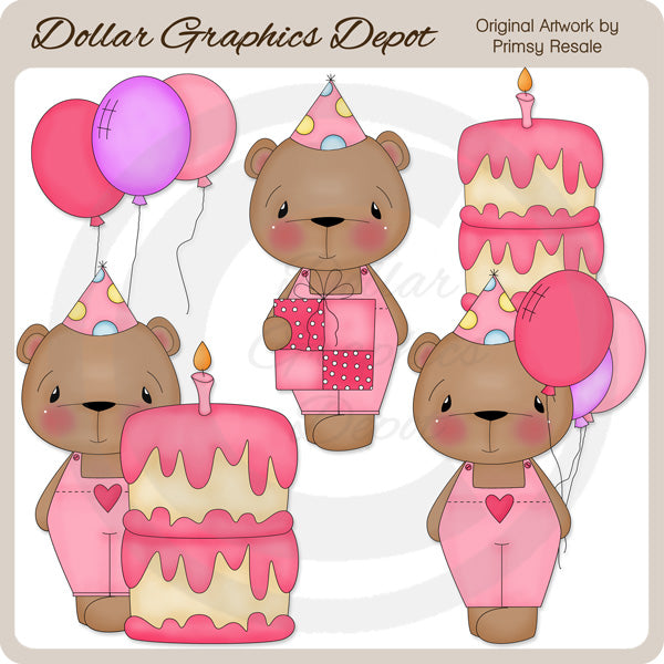 This collection includes adorable, little, birthday girl bears, party hats, birthday balloons, layered birthday cakes with frosting and candles, and a wrapped birthday present. This set contains 5 graphics.
