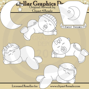 This collection includes four sleeping babies with baby pajamas, pretty hair bows, a baby hat, and pacifiers, one moon with a little star and bow, and one baby cradle with "Sweet Dreams" word art. This set contains 6 digital stamps.