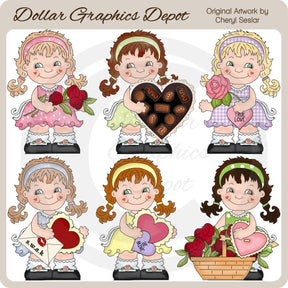 This one-of-a-kind collection is only available at Digital Craft Supplies. This set includes six adorable little girls, with pretty patterned dresses, headbands, pigtails, and little heart cheeks, red roses, a heart shaped box of chocolates, a pink rose, Conversation Hearts, scalloped Valentine hearts, a Valentine card in an envelope, and a basket filled with red roses. This exclusive set contains 6 graphics.