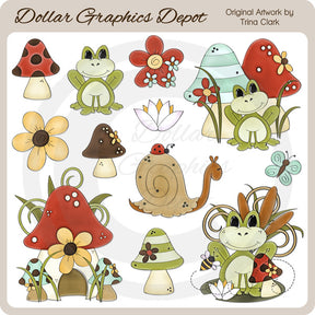 This large collection includes spotted and striped mushrooms, cute little frogs, colorful flowers, grass, cattails, a lily pad, lilies, a bumble bee, a snail, a ladybug, and a butterfly. PLEASE NOTE: This set coordinates with the "Toadstools - Scrap Papers" collection. This set contains 12 graphics.