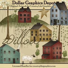 This collection includes beautiful saltbox houses, grassy hills. trees, a wooly sheep, golden star, willow trees, and "Willow" word art. PLEASE NOTE: This set coordinates with the "Willow - Scrap Papers" collection. This set contains 10 graphics.